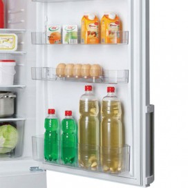 Описание: Холодильное отделение укомплектовано 3 стеклянными, переставляемыми по высоте полками и 2 ящиками для овощей и фруктов. На двери холодильного отделения предусмотрены 4 пластиковые прозрачные полки.