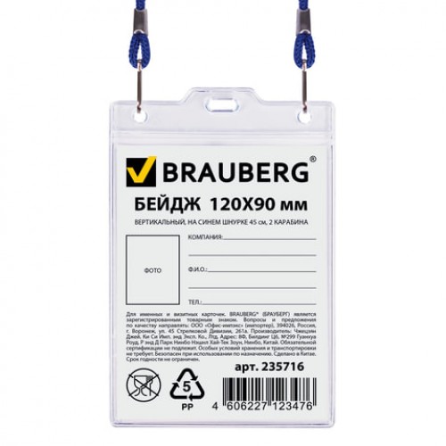 Бейдж вертикальный БОЛЬШОЙ (120х90 мм) на синем шнурке 45 см, 2 карабина, BRAUBERG, 235716