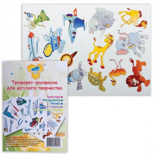 Трафарет-раскраска ПЧЕЛКА, НАБОР 6 шт. (транспортир, инструменты, космос, животные, море, листья), НТР-2
