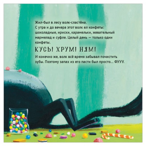 Целыми днями он хрустел и хрустел леденцами и шоколадками, но забывал чистить зубы утром и вечером. Как сложилась дальнейшая судьба волка-сладкоежки, можно узнать, прочитав сказку.