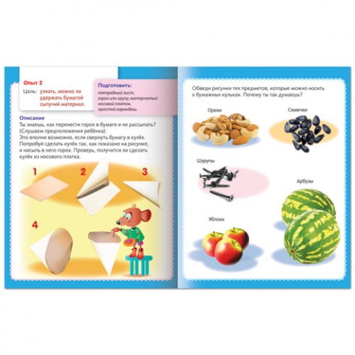 Описание: Всё, что необходимо для опытов, можно найти дома. Результаты наблюдений малыш будет фиксировать в этой же тетради, что очень удобно. Исследования можно проводить как с одним ребёнком, так и с группой детей.