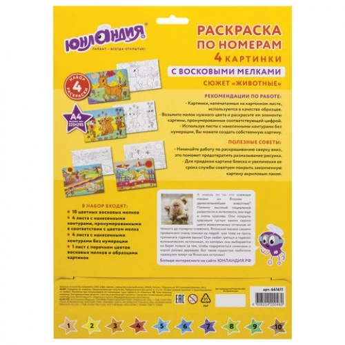 Раскраска по номерам А4, ЮНЛАНДИЯ 'ЖИВОТНЫЕ', С ВОСКОВЫМИ МЕЛКАМИ, 4 картинки, 661611