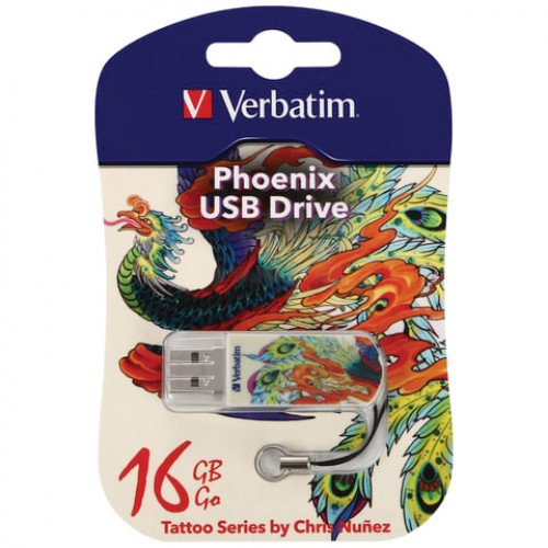 Флэш-диск 16 GB, VERBATIM Mini Tattoo Edition Phoenix, USB 2.0, белый с рисунком, 49887