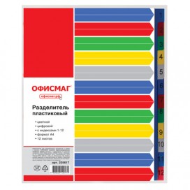 Разделитель пластиковый ОФИСМАГ, А4, 12 листов, цифровой 1-12, оглавление, цветной, РОССИЯ, 225617