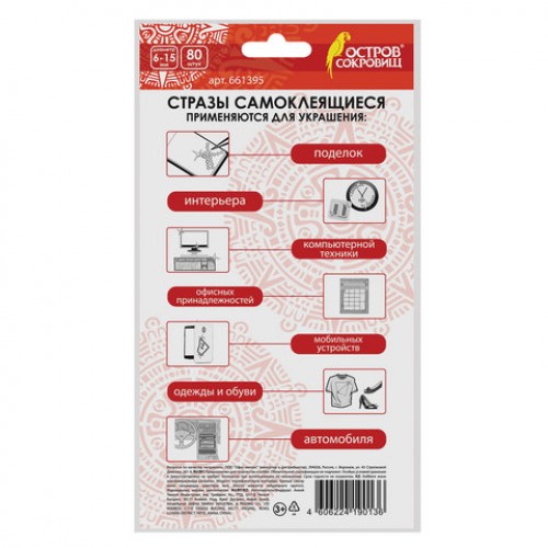 Стразы самоклеящиеся 'Квадрат', 6-15 мм, 80 шт., розовые/красные, на подложке, ОСТРОВ СОКРОВИЩ, 661395