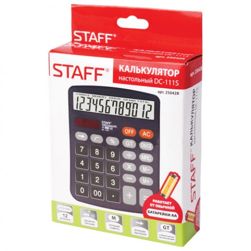Калькулятор настольный STAFF PLUS DC-111S, КОМПАКТНЫЙ (150x120 мм), 12 разрядов, двойное питание, + БАТАРЕЙКА АА, 250428