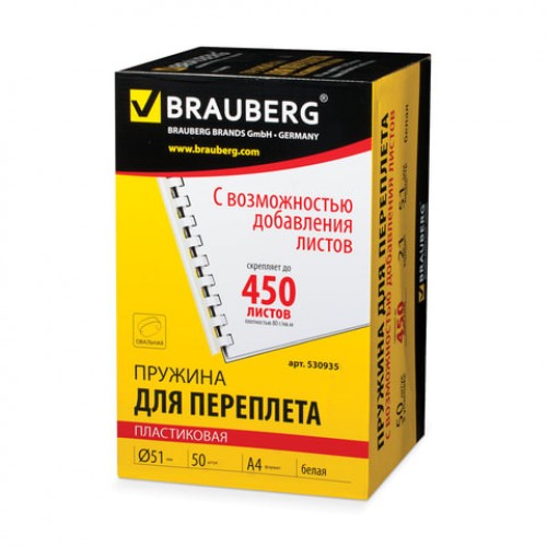 Пружины пластиковые для переплета, КОМПЛЕКТ 50 шт., 51 мм (для сшивания 411-450 л.), белые, BRAUBERG, 530935